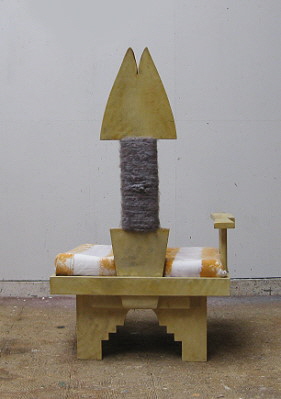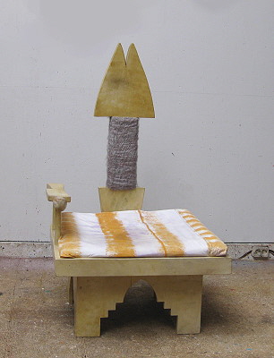 Dieser Sitzhocker ist aus Fichte massiv und vollständig mit Acrylfarben bemalt.Die Rücklehne ist mit Wolle umwickelt und das Sitzkissen mit Schafwolle gefüllt.H = 124 cm B = 72 cm T = 69 cm