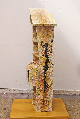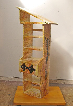 Dieses Regal hat eine Schublade, fünf Fächer sowie ein Pultdach.Der gesamte Körper ist aus Massivholz Fichte und vollständig bemalt.