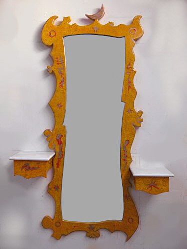 Dieses Spiegelobjekt besteht aus Fichte Massiv-Holz, hat einen Steingrund, ist vollständig mit Acrylfarben bemalt und mit Schellack lackiert. Die beiden seitlichen Kästchen haben jeweils eine Schublade und darüber eine Ablage aus weißem Carrara-Marmor. Dieser Spiegel ist ein Ganzkörperspiegel.